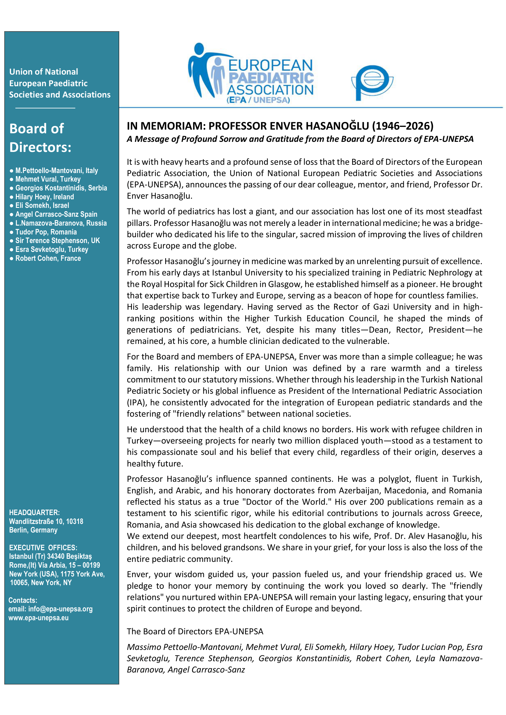 Founded 50 years ago, it now represents 50 National European Paediatric Societies and Associations and operates on a non-profit basis. Its General Assembly is made by the Presidents of the major national pediatric societies active in the Nations of geographic Europe, and currently represents more than three-quarters of all European countries, working closely with the major international organizations, including WHO, UN, EMA and the Council of Europe. Since its foundation in 1976 in the St Sophia Children’s Hospital in Rotterdam, Holland, in its role as prominent European paediatric organization, EPA-UNEPSA has typically encouraged education of patients, families and care givers by translating specialistic knowledge to generalists, and worked to improve the quality of paediatric patient care in all European countries including both member and non-member states of the European Union, by adequate clinical research and by implementing research into practice.